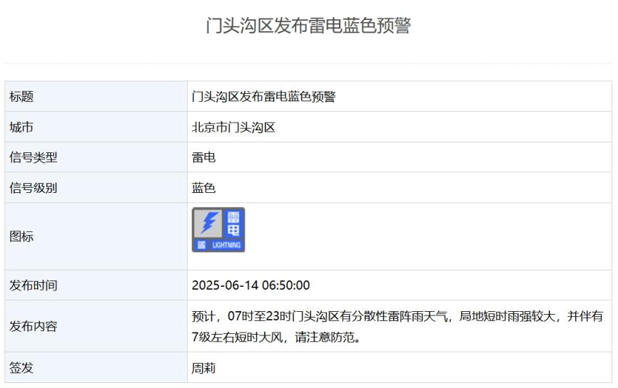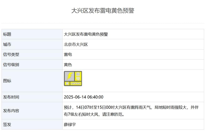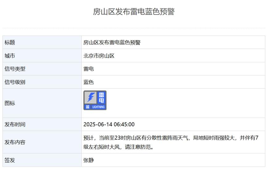 6月14日,北京市大兴、房山、门头沟、昌平等多区发布雷电预警,其中大兴区发布雷电黄色预警,房山、门头沟、昌平发布雷电蓝色预警。